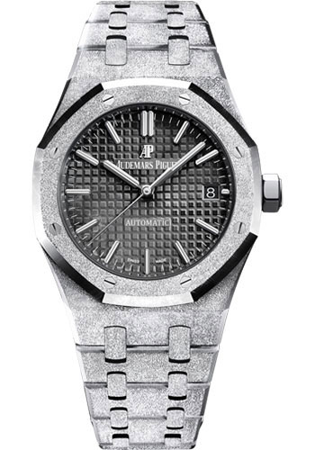 37 mm hammered 18K white gold case, 9.8 mm thick, sapphire crystal back, screw-locked crown, black dial with Grande Tapisserie pattern, white gold applied hour-markers and Royal Oak hands with luminescent coating, Manufacture Calibre 3120 selfwinding movement with hours, minutes, centre seconds and date, approximately 60 hours of power reserve, hammered 18K white gold bracelet, AP folding buckle. Water resistant to 50 m.
