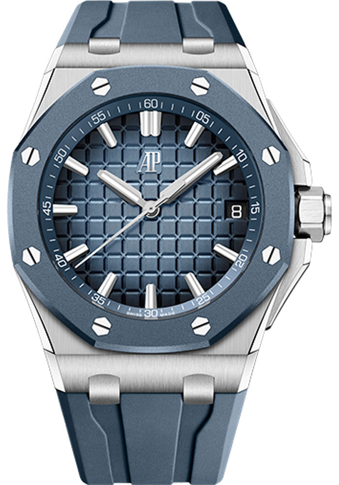 43 mm stainless steel case, 14.4 mm thick, smoked blue dial with méga tapisserie pattern, white gold hour-markers and royal oak hands with luminescent coating, blue inner bezel, Calibre 4302 selfwinding movement with hours, minutes, centre seconds and date, approximately 70 hours of power reserve, blue rubber strap, stainless steel pin buckle. Water resistant to 100 m.