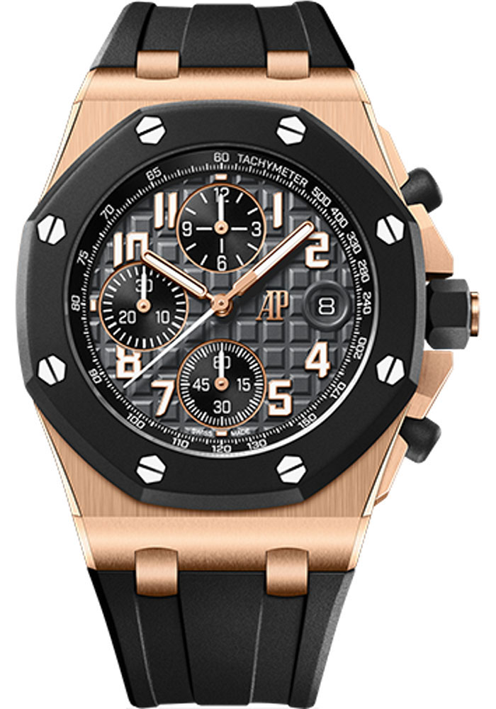 42 mm 18K pink gold case, 15.3 mm thick, anthracite grey dial with méga tapisserie pattern, black counters and inner bezel, arabic numeral hour-markers and pink gold royal oak hands with luminescent coating, Calibre 4404 selfwinding movement with flyback chronograph, hours, minutes, small seconds and date, approximately 70 hours of power reserve, black rubber strap with interchangeable strap system, 18K pink gold AP pin buckle. Water resistant to 100 m.