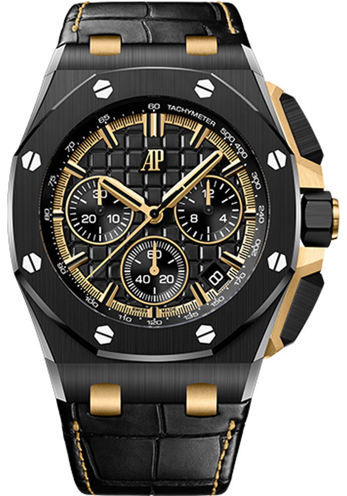 43 mm black ceramic case, 14.4 mm thick, black dial with méga tapisserie pattern, black counters and external zone, yellow gold applied hour-markers and royal oak hands with black paint, black inner bezel, Calibre 4401 selfwinding movement with flyback chronograph, hours, minutes, small seconds and date, approximately 70 hours of power reserve, black alligator strap with interchangeable strap system, 18K yellow gold pin buckle. Water resistant to 100 m.