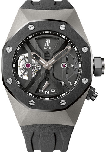 44mm x 16.05mm titanium case, sapphire crystal back, screw-locked push pieces and crown, black ceramic bezel, glareproofed sapphire crystal, openworked dial with second time-zone indicator at 3 o’clock, crown position indicator at 6 o’clock, tourbillon at 9 o’clock with black anodized aluminium bridge, white gold Royal Oak hands, and black anodized aluminium flange, manual-winding Audemars Piguet Calibre 2913 movement with tourbillon, GMT 24h, functions selection, hours, and minutes , approximately 237 hours of power reserve, black rubber strap with titanium AP folding buckle. Water resistant to 100 meters.