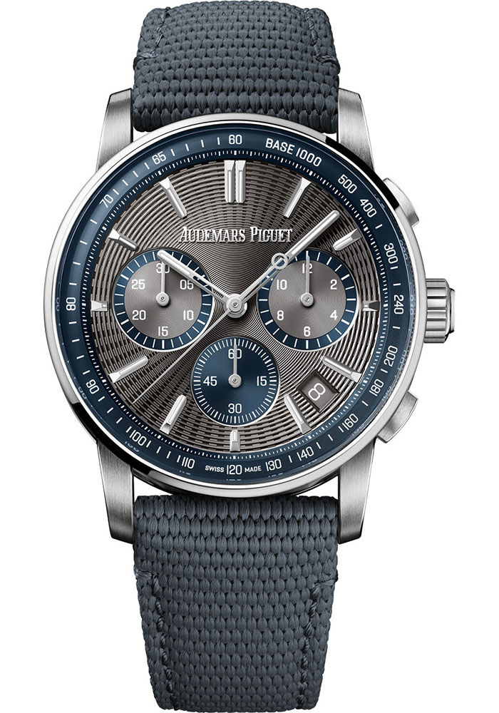 41 mm stainless steel case, 12.6 mm thick, grey embossed dial is paired with 18-carat white gold luminescent hour-markers and hands, while the inner bezel and the external zones of the counters are executed in blue, Calibre 4401 selfwinding movement with flyback chronograph, hours, minutes, small seconds and date, approximately 70 hours of power reserve, grey rubber-coated strap, stainless steel pin buckle. Water resistant to 30 m.