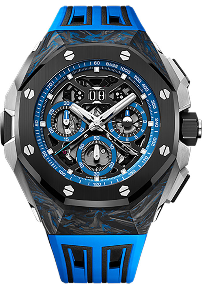 43 mm carbon case, 17.5 mm thick, openworked dial with black counters with blue external zone, white gold hour-markers and hands with luminescent coating, titanium chronograph and split-second hands, blue inner bezel, Calibre 4407 selfwinding movement with split second chronograph, gmt 24h, function selection, hours and minutes, approximately 70 hours of power reserve, black rubber strap with interchangeable strap system, titanium AP folding buckle. Water resistant to 50 m.