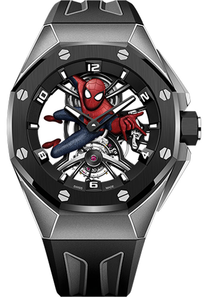 42 mm titanium case, 14.6 mm thick, openworked dial with "spider-man" figure, white gold hour-markers and hands with luminescent coating, Calibre 2974 hand-wound movement with tourbillon, hours and minutes, approximately 72 hours of power reserve, black rubber strap with interchangeable strap system, titanium AP folding buckle. Water resistant to 50 m.