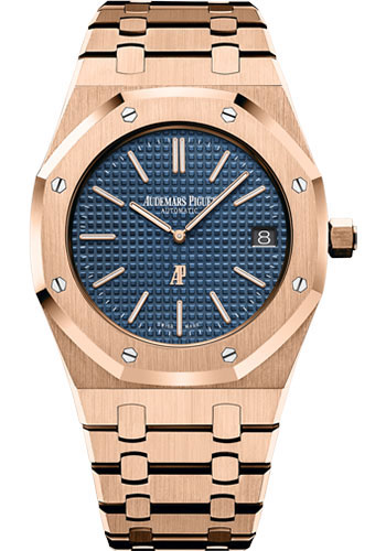 39mm x 49mm x 8.10mm 18K pink gold case, sapphire crystal back, screw-locked crown, glareproofed sapphire crystal, blue dial with petite tapisserie pattern, gold applied hour-markers, and Royal Oak hands with luminescent coating, self-winding Audemars Piguet Calibre 2121 movement with date, approximately 40 hours of power reserve, 18K pink gold bracelet. Water resistant to 50 meters.