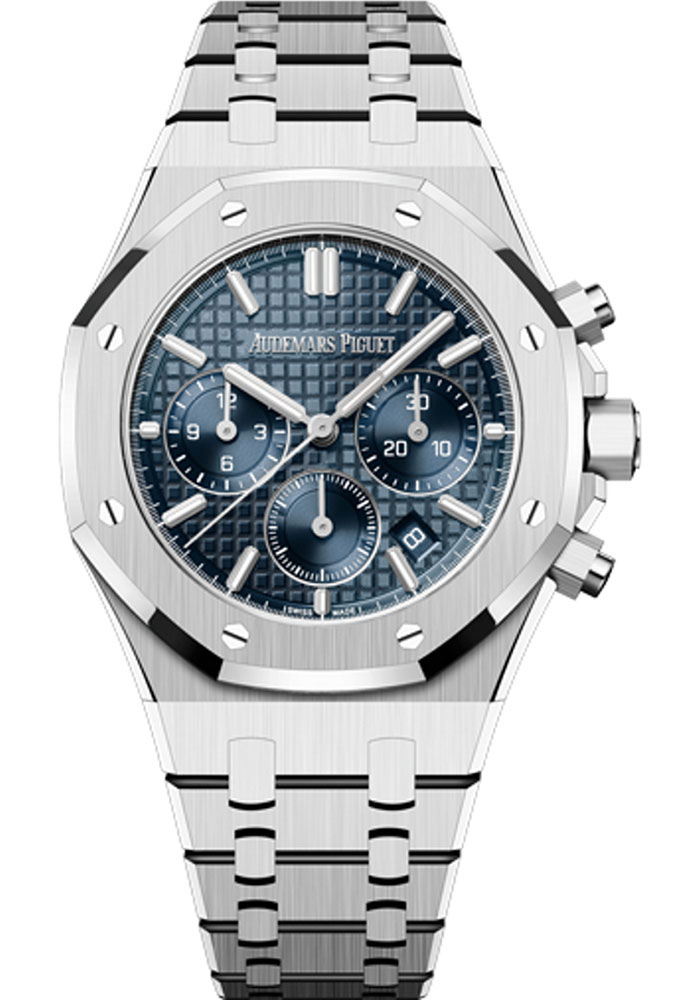 38 mm stainless steel case, 11 mm thick, bleu nuit nuage 50 dial with grande tapisserie pattern, bleu nuit nuage 50 counters, white gold applied hour-markers and royal oak hands with luminescent coating, Calibre 2385 selfwinding movement with chronograph, hours, minutes, small seconds and date, approximately 40 hours of power reserve, stainless steel bracelet, AP folding buckle. Water resistant to 50 m.