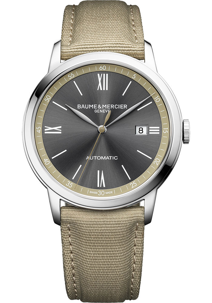 Baume & Mercier Style No: M0A10695Baume & Mercier Classima Automatic Watch - Date Display - 42mm Steel Case - Sun Satin-Finished Slate-Grey Dial - Beige Polyester Strap