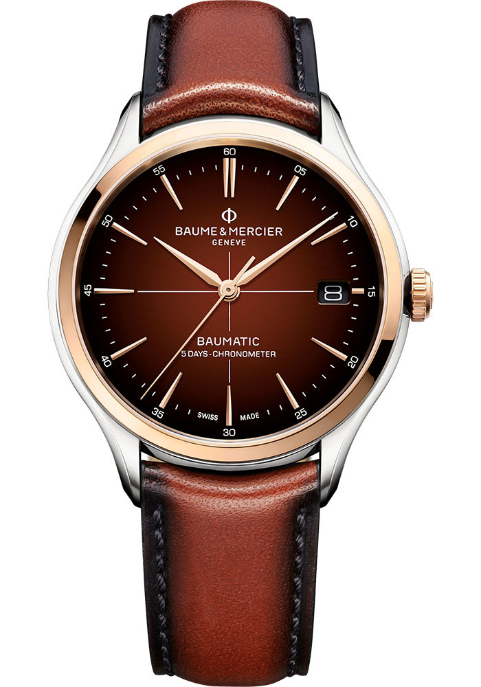 Baume & Mercier Style No: M0A10713Baume & Mercier Clifton Automatic Watch - COSC Certified - Date - 40 mm Steel And Steel Pink Gold Capped Case - Gradient Chocolate Dial - Calf Leather Strap