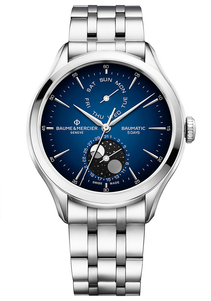 42 mm polished and satin finished steel case, 13.2 mm thick, gradient blue lacquered dial, BM14-1975AC2 self-winding automatic movement with moon phase, day date, approximately 120 hours of power reserve, polished and satin-finished steel bracelet. Water resistant to 50 meters.