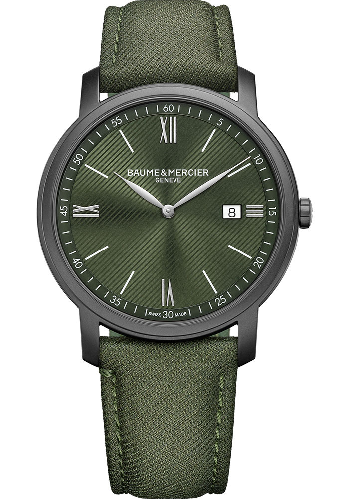 42mm microbillé steel and adlc case, 6.0 mm thick, opaline, sunray green dial, quartz movement with minutes, hours, calendar aperture, green fabric strap, ardillon buckle. Water resistant to 30 meters.