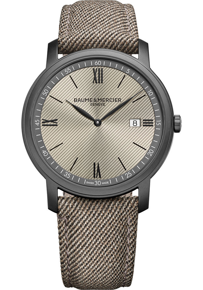 42mm microbillé steel and adlc case, 6.0 mm thick, brillant, sunray grey dial, quartz movement with minutes, hours, calendar aperture, sand-coloured fabric strap, ardillon buckle. Water resistant to 30 meters.
