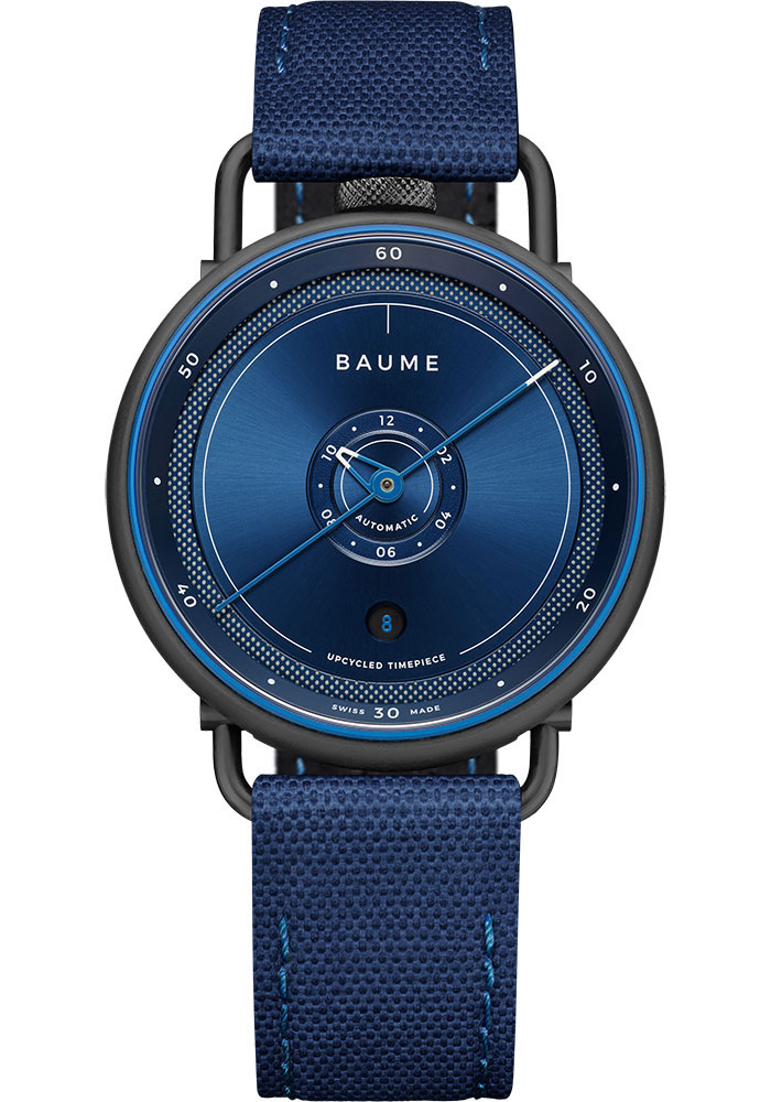 42mm polished aluminium case, 10.2 mm thick, sun satin-finished oceanic blue dial, BM 11200 self-winding automatic movement with date, approximately 38 hours of power reserve, blue recycled plastic strap, ardillon buckle. Water resistant to 30 meters.