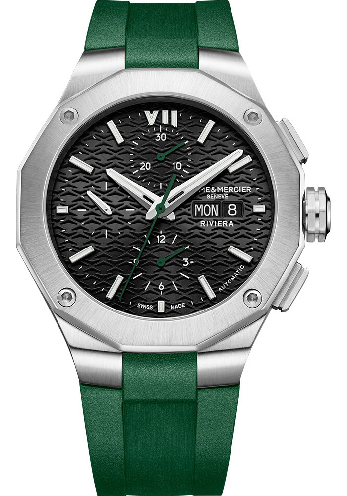 43mm polished and satin finished steel case, 14.1 mm thick, sapphire crystal back, satin-sunray black dial, self-winding automatic movement with small seconds, minutes, hours, calendar aperture, chronograph, approximately 48 hours of power reserve, green strap. Water resistant to 100 meters.