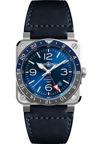 42 mm satin-finished and polished steel case, bi-directional rotating bezel with 24-hour scale and blue and grey two-colour anodized aluminum ring, sapphire crystal with anti-reflective coating, blue sunray dial with indices coated in super-luminova, calibre BR-CAL.303 automatic movement with hours, minutes, central seconds, second 24-hour time zone and date, quick setting of the gmt hand, independently of the hour hand, blue calfskin leather and ultra-resilient black synthetic fabric strap, pin buckle. Water resistant to 100 metres.