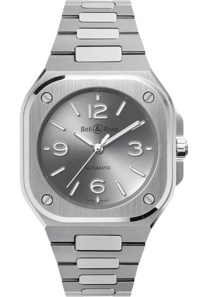 36 mm satin-polished steel case, 8.5 mm thick, screw-down crown, sapphire crystal with anti-reflective coating, grey sunray dial with baignoire-style applique numerals and indexes filled with white super-luminova x1 (green emission), calibre Caliber BR-CAL.329 automatic movement with hours, minutes, and seconds, approximately 54-hour of power reserve, satin-polished steel bracelet, folding buckle. Water resistant to 100 metres.