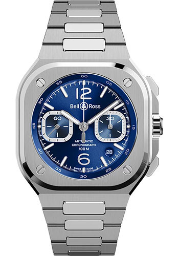 42 mm satin-finished and polished steel case, sapphire back with a 360° oscillating weight, screw-down crown, sapphire crystal with anti-reflective coating, blue sunray dial with super-luminova-filled applique numerals and indices, calibre BR-CAL.326 automatic movement with hours, minutes, small seconds at 9 o’clock and date, chronograph, blue rubber or satin-finished and polished steel bracelet, folding buckle. Water resistant to 100 meters.
