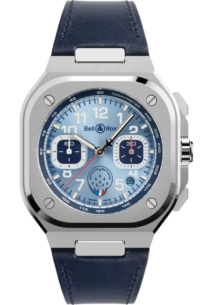 42 mm x 14.25 mm satin-finish polished steel case, screw-down crown, sapphire crystal with anti-reflective coating, sunny blue dial with patrouille de france logo at 6 o'clock, calibre BR-CAL.326 automatic movement with hours, minutes, small seconds at 9 o'clock and date, chronograph, approximately 60-hour of power reserve, blue-coloured calfskin leather strap, folding buckle. Water resistant to 100 metres.