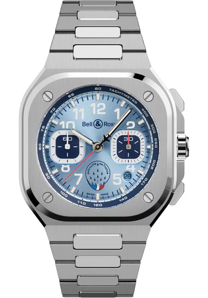 42 mm x 14.25 mm satin-finish polished steel case, screw-down crown, sapphire crystal with anti-reflective coating, sunny blue dial with patrouille de france logo at 6 o'clock, calibre BR-CAL.326 automatic movement with hours, minutes, small seconds at 9 o'clock and date, chronograph, approximately 60-hour of power reserve, satin-finished bracelet, folding buckle. Water resistant to 100 metres.