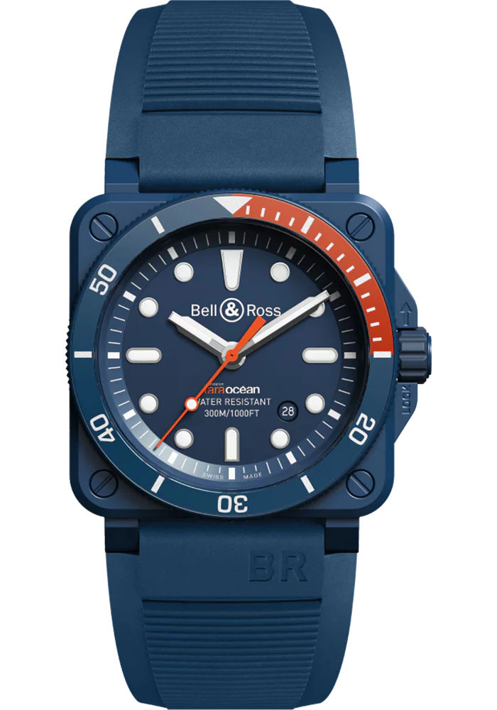 42 mm matte blue ceramic case, unidirectional rotating ceramic bezel with 60-minute scale, sapphire crystal with anti-reflective coating, blue dial with metal applique skeleton super-luminova-filled numerals and indices, calibre BR-CAL.302 automatic movement with hours, minutes, seconds and date, woven blue rubber and ultra-resilient strap, pin buckle with PVD (Physical Vapor Deposition) finish. Water resistant to 300 metres.