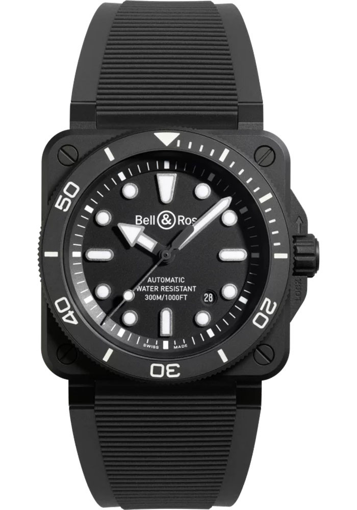 42 mm matt black ceramic case, unidirectional rotating bezel with 60-minute scale in black ceramic, sapphire crystal with anti-reflective coating, black dial with skeletonised metal applique hands and indices filled with white super-luminova, calibre BR-CAL.302-1 automatic movement with hours, minutes, seconds and date, woven black rubber and ultra-resilient black synthetic fabric strap, pin buckle with black PVD (Physical Vapour Deposition) finish. Water resistant to 300 metres.