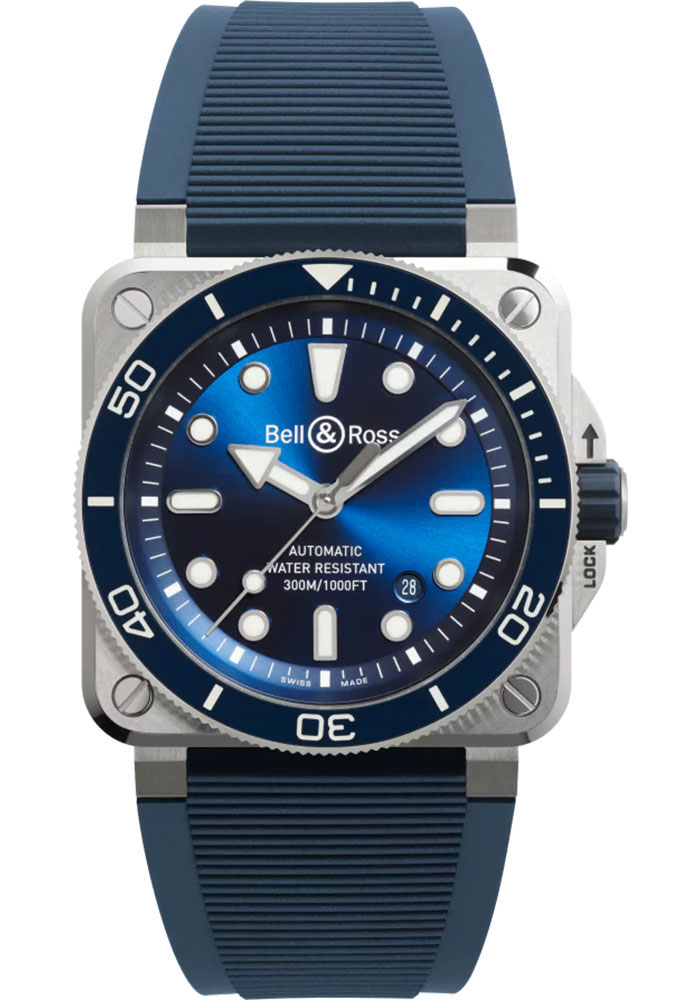 42 mm satin-finished and polished steel case, unidirectional rotating steel bezel with 60-minute scale in blue ceramic, sapphire crystal with anti-reflective coating, blue sunray dial with skeletonised metal applique hands and indices filled with white super-luminova, calibre BR-CAL.302-1 automatic movement with hours, minutes, seconds and date, woven blue rubber and ultra-resistant synthetic black fabric strap, pin buckle. Water resistant to 300 metres.