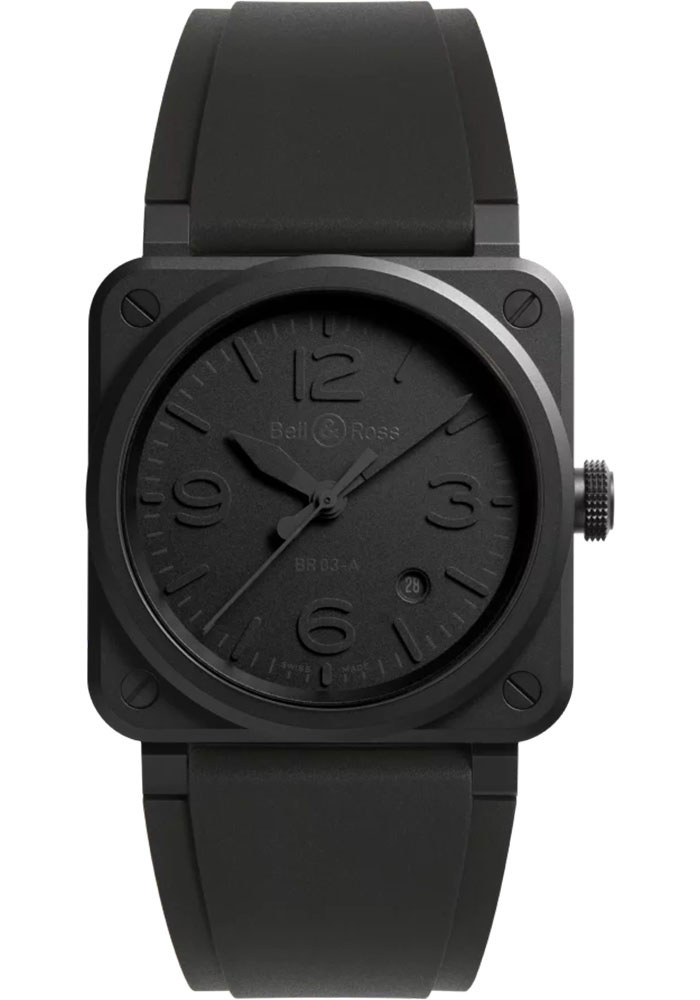 41 mm microblasted black ceramic case, 10.60 mm thick, sapphire crystal with anti-reflective coating, black dial with numerals and indices made from moulded luminescent material/bilight, calibre BR-CAL.302-1 automatic movement with hours, minutes, seconds and date, black rubber and ultra-resilient black synthetic fabric strap, pin buckle with matt black PVD (Physical Vapour Deposition) microblasted finish. Water resistant to 100 metres.