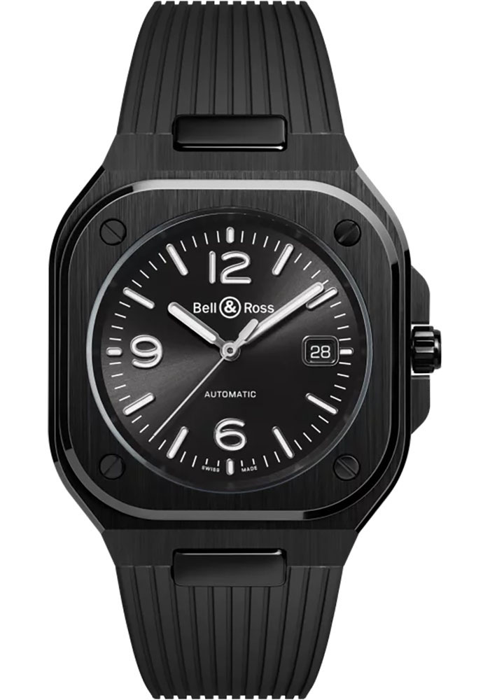 41 mm x 11.2 mm thick polished and satin-finished black ceramic case, 41 mm wide, 11.2 mm thick, sapphire back with 360° oscillating weight, screw-down crown, sapphire crystal with anti-reflective coating, black sunray dial with skeletonised hour and minute hands filled with white super-luminova (green glow), calibre BR-CAL.321-1 Automatic mechanical automatic movement with hours, minutes, seconds and date, black rubber strap, steel folding buckle buckle with black PVD (Physical Vapour Deposition) finish. Water resistant to 100 metres.