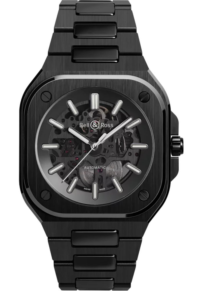 41 mm satin-finished and polished ceramic case, 11.2 mm thick, sapphire back with 360° oscillating weight, screw-down crown, sapphire crystal with anti-reflective coating, skeletonised black tinted transparent dial with applique indices filled with white super-luminova (green glow), calibre BR-CAL.322-1 Automatic mechanical automatic movement with hours, minutes and seconds, ceramic strap, steel folding buckle buckle with black PVD (Physical Vapour Deposition) finish. Water resistant to 100 metres.