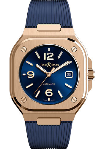40 mm satin-finished and polished 18 ct rose gold case, sapphire back with a 18 ct rose gold plated 360° oscillating weight, screw-down crown, sapphire crystal with anti-reflective coating, blue sunray dial with rose gold gilded applique numerals and indices filled with super-luminova, calibre BR-CAL.321 automatic movement with hours, minutes, seconds and date, blue rubber strap, folding buckle. Water resistant to 100 metres.