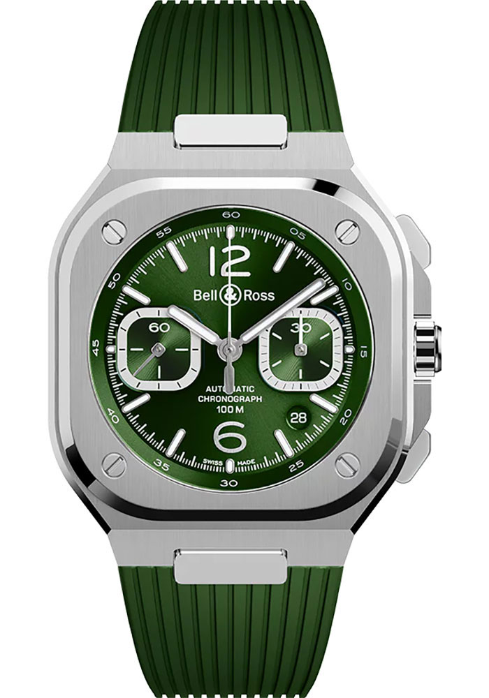 42 mm x 14.25 mm thick satin-polished steel case, 42 mm wide, 14.25 mm thick, sapphire back with 360° oscillating weight, screw-down crown, sapphire crystal with anti-reflective coating, green sunray dial with applique indices filled with super-luminova, calibre BR-CAL.326 automatic movement with hours, minutes, small seconds at 9 o'clock and date, chronograph, green rubber strap, folding buckle. Water resistant to 100 metres.