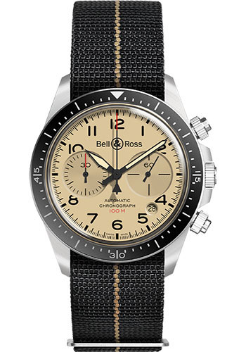 41 mm satin-polished steel case, sapphire back, screw-down crown, bezel with scale and anodised aluminium insert and tachymeter, ultra-curved sapphire crystal with anti-reflective coating, beige dial, calibre BR-CAL.301 automatic movement with hours, minutes, small seconds at 3 o'clock, date, chronograph, black and beigh elastic canvas strap, pin buckle. Water resistant to 100 meters.