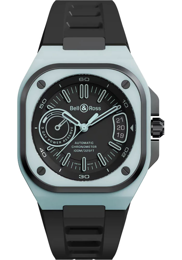 41 mm grade 2 microblasted titanium case with DLC (diamond-like carbon) finish, 12.80 mm thick, back in grade 2 microblasted titanium with smoked grey sapphire crystal with anti-reflective coating, screw-down crown, fixed bezel in grade 2 microblasted titanium with bezel insert in luminescent composite, sapphire crystal with anti-reflective coating, matt black dial with block applique indices in blue super-luminova filled with black lacquer, calibre BR-CAL.323 automatic movement with hours, minutes and seconds, date window at 3 o'clock and power reserve indicator at 9 o'clock, openworked black rubber strap, folding buckle with DLC (diamond-like carbon) finish. Water resistant to 100 metres.