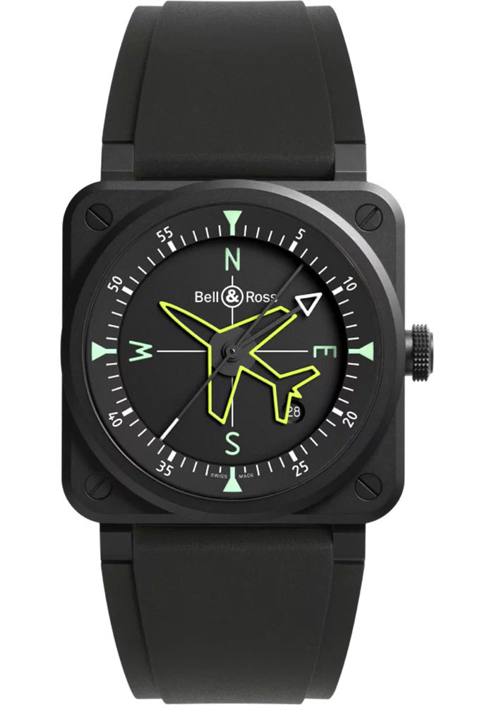 41 mm matte black ceramic case, 10,60 mm thick, sapphire crystal with anti-reflective coating, black dial with cardinal points and triangle-shaped indices coated with green super-luminova, calibre BR-CAL.302-1 automatic movement with hours, minutes, seconds and date, black rubber and ultra-resilient black synthetic fabric strap, pin buckle with black PVD (Physical Vapor Deposition) finish. Water resistant to 100 metres.