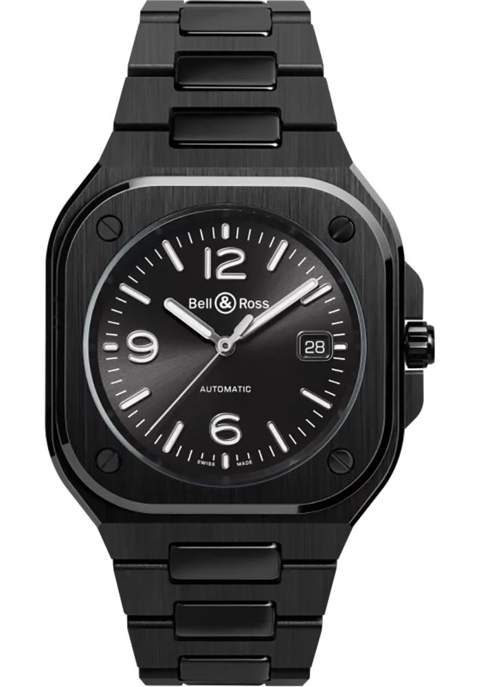 41 mm x 11.2 mm thick polished and satin-finished black ceramic case, 41 mm wide, 11.2 mm thick, sapphire back with 360° oscillating weight, screw-down crown, sapphire crystal with anti-reflective coating, black sunray dial with skeletonised hour and minute hands filled with white super-luminova (green glow), calibre BR-CAL.321-1 Automatic mechanical automatic movement with hours, minutes, seconds and date, ceramic strap, steel folding buckle buckle with black PVD (Physical Vapour Deposition) finish. Water resistant to 100 metres.