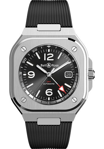 41 mm satin-finished and polished steel case, sapphire back with 360° oscillating weight, screw-down crown, sapphire crystal with anti-reflective coating, black sunray dial with numerals and indices coated in white super-luminova, calibre BR-CAL.325 Automatic mechanical. automatic movement with hours, minutes, central seconds, second 24-hour time zone and date, quick setting of the gmt hand, independently of the hour hand, black rubber strap, folding buckle. Water resistant to 100 metres.