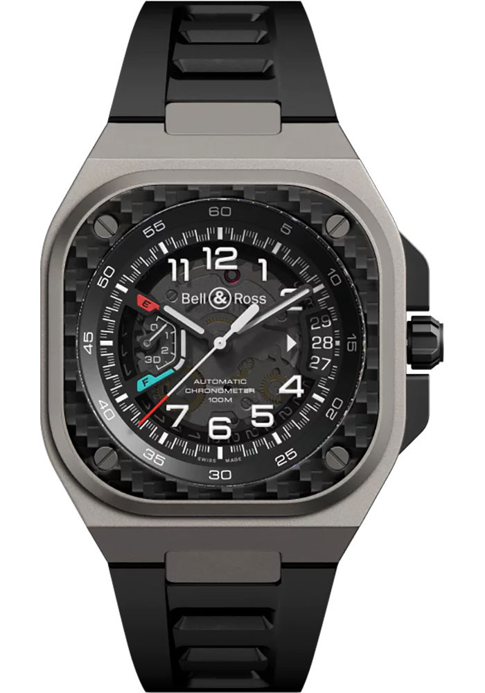 41 mm titanium case, 12.80 mm thick, sapphire back with oscillating weight, screw-down crown, bezel with woven carbon fibre decoration, sapphire crystal with anti-reflective coating, fumé dial with matt black hour and minute hands filled with white super-luminova, calibre BR-CAL.323 automatic movement with hours, minutes and seconds, date window at 3 o'clock and power reserve indicator at 9 o'clock, titanium strap, folding buckle. Water resistant to 100 metres.
