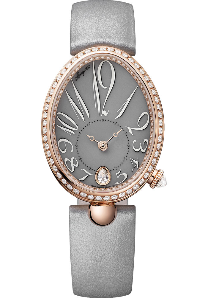 28.5 mm 18k rose gold case set with 1 briolette-cut diamond, 117 brilliant-cut diamonds, 10.1 mm thick, diamond-set crown, grand feu grey enamel dial set with 1 pear-cut diamond, calibre Movement 537/3 automatic movement, approximately 45 hours hours of power reserve, calf strap. Water resistant to 3 bar meters.