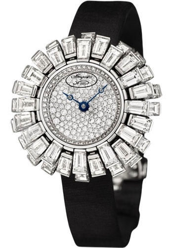 33.8 mm white gold 18k case set with 43 baguette-cut diamonds, 48 brilliant-cut diamonds, 12.4 mm thick, rhodium-plated dial set with 141 brilliant-cut diamonds, calibre Movement 586/1 automatic movement, approximately 38 hours hours of power reserve, satin strap. Water resistant to 3 bars meters.