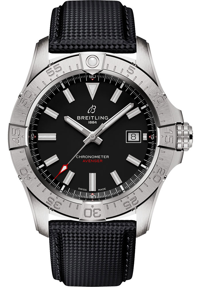 42.0 mm stainless steel case, 12.1 mm thick, screw-locked crown with two gaskets, unidirectional ratcheted bezel, cambered sapphire crystal with glareproof treatment on both sides, black dial, Breitling 17 self-winding movement, approximately 38 hrs of power reserve, black calfskin leather strap, folding buckle. Water resistant to 300 m (1,000 ft).