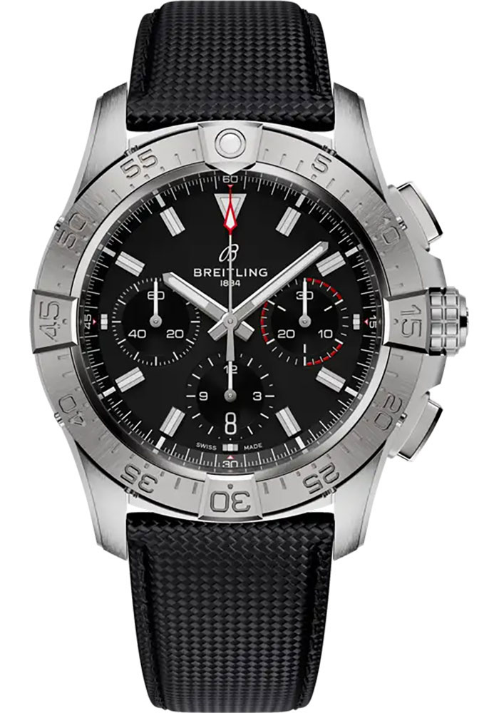 42.0 mm stainless steel case, 15.05 mm thick, transparent sapphire crystal back, screw-locked crown with two gaskets, unidirectional ratcheted bezel, cambered sapphire crystal with glareproof treatment on both sides, black dial, Breitling 01 (Manufacture) self-winding movement, approximately 70 hrs of power reserve, anthracite calfskin leather strap, folding buckle. Water resistant to 300 m (1,000 ft).