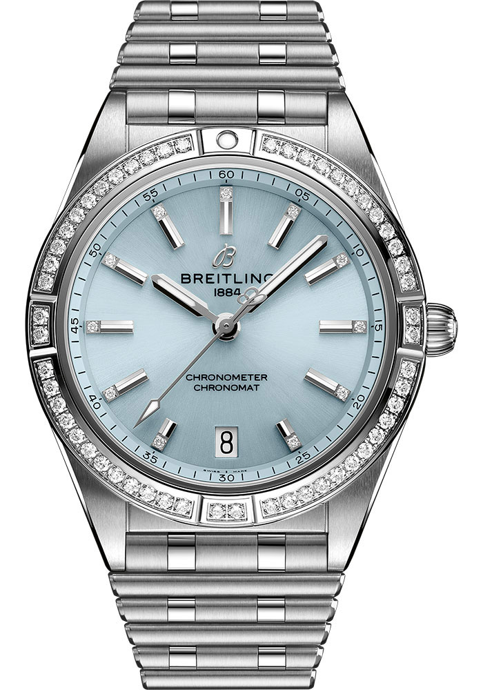 36.0 mm stainless steel and 18K white gold case, 10.0 mm thick, non screw-locked crown with two gaskets, unidirectional ratcheted rotating bezel, cambered sapphire crystal with glareproof treatment on both sides, ice blue dial, Breitling 10 self-winding movement, approximately 42 hours of power reserve, stainless steel and 18K white gold bracelet. Water resistant to 10 bars.
