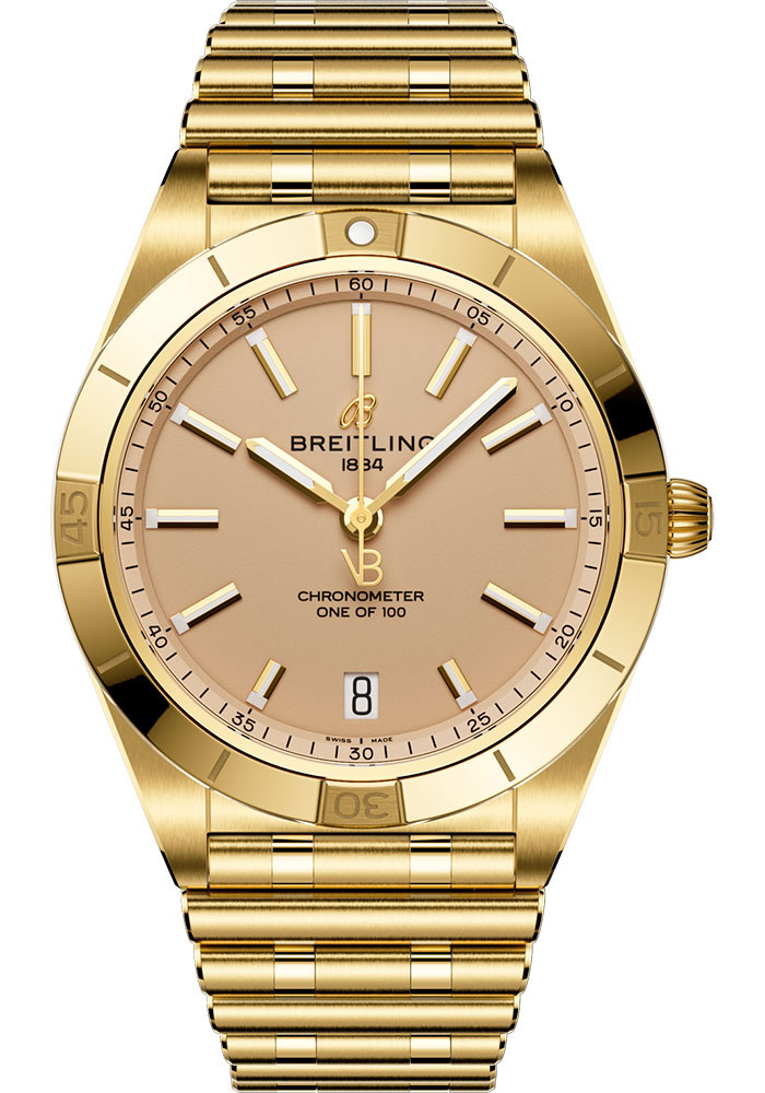 36.0 mm 18K yellow gold case, 10.0 mm thick, non screw-locked crown with two gaskets, unidirectional ratcheted bezel, cambered sapphire crystal with glareproof treatment on both sides, sand dial, Breitling 10 self-winding movement, approximately 42 hours of power reserve, 18K yellow gold bracelet. Water resistant to 10 bars.