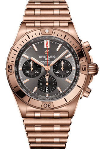 42.0 mm 18K red gold case, 15.1 mm thick, transparent sapphire crystal back, screw-locked crown with two gaskets, unidirectional ratcheted bezel, cambered sapphire crystal with glareproof treatment on both sides, anthracite dial, Breitling 01 (Manufacture) self-winding movement, approximately 70 hrs of power reserve, 18K red gold bracelet. Water resistant to 200 m (660 ft).