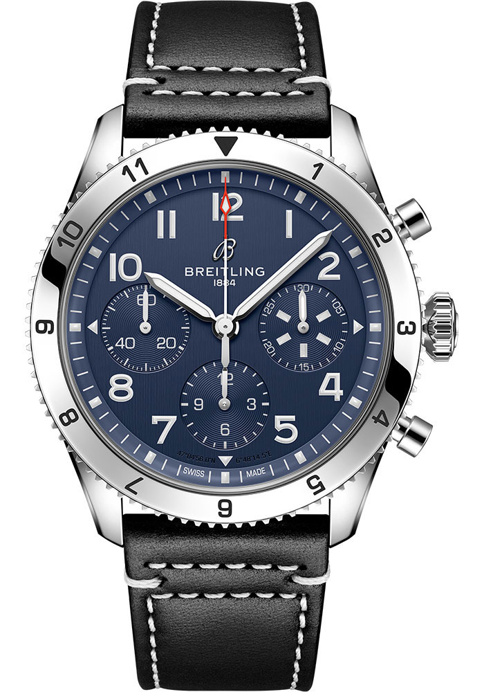42.0 mm stainless steel case, 14.7 mm thick, screw-locked crown with two gaskets, bidirectional ratcheted bezel, blue dial, Breitling 23 self-winding movement, approximately 48 hrs of power reserve, black calfskin leather strap, folding buckle. Water resistant to 10 bars.