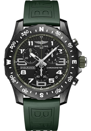 38.0 mm Breitlight case, 12.10 mm thick, non screw-locked crown with two gaskets, bidirectional compass scale bezel, black dial, Breitling 83 thermocompensated SuperQuartz™ movement, red rubber strap, tang buckle. Water resistant to 10 bars.