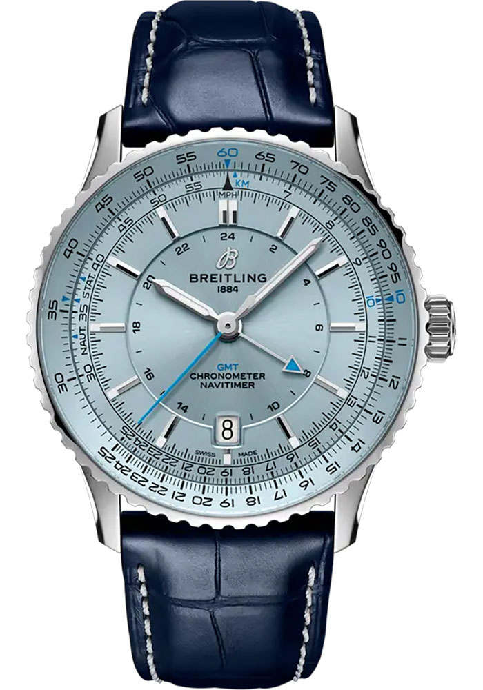 41.0 mm stainless steel case, 11.65 mm thick, non screw-locked crown with two gaskets, cambered sapphire crystal with glareproof treatment on both sides, ice-blue dial, Breitling 32 self-winding movement, approximately 42 hours of power reserve, blue alligator leather strap, folding buckle. Water resistant to 3 bars.