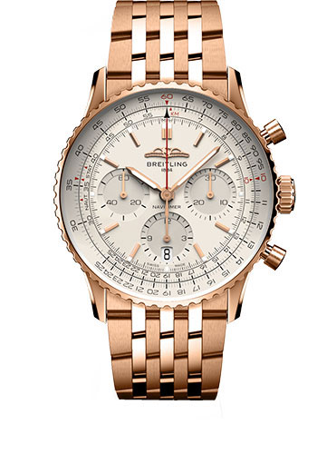 41.0 mm 18K red gold case, 13.6 mm thick, transparent sapphire crystal back, non screw-locked crown with two gaskets, bidirectional slide rule bezel, cambered sapphire crystal with glareproof treatment on both sides, silver dial, Breitling 01 (Manufacture) self-winding movement, approximately 70 hrs of power reserve, 18K red gold bracelet. Water resistant to 3 bars.