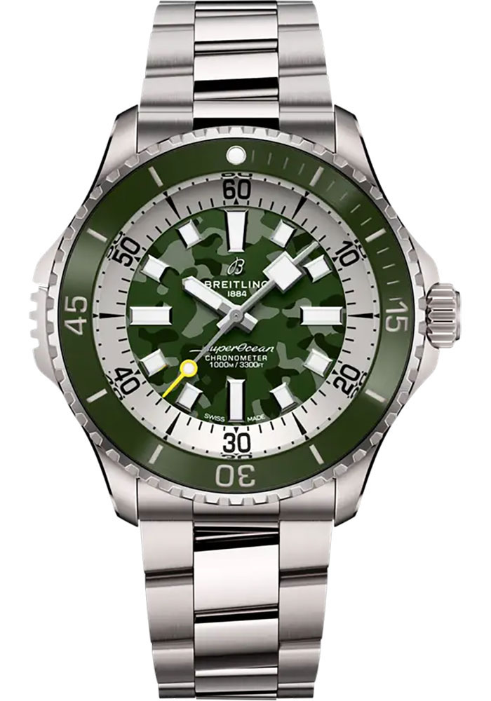 46.0 mm titanium case, 0.00 mm thick, screw-locked crown with two gaskets, cambered sapphire crystal with glareproof treatment on both sides, green dial, Breitling 10 self-winding movement, approximately 42 hours of power reserve, titanium bracelet. Water resistant to 1,000 m (3,300 ft).