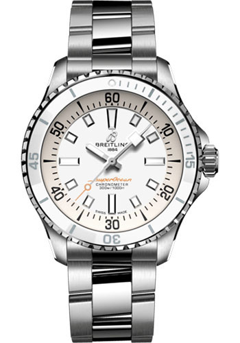 36.0 mm stainless steel case, 12.2 mm thick, screw-locked crown with two gaskets, unidirectional ratcheted bezel, cambered sapphire crystal with glareproof treatment on both sides, white dial, Breitling 17 self-winding movement, approximately 38 hrs of power reserve, stainless steel bracelet. Water resistant to 300 m (1,000 ft).