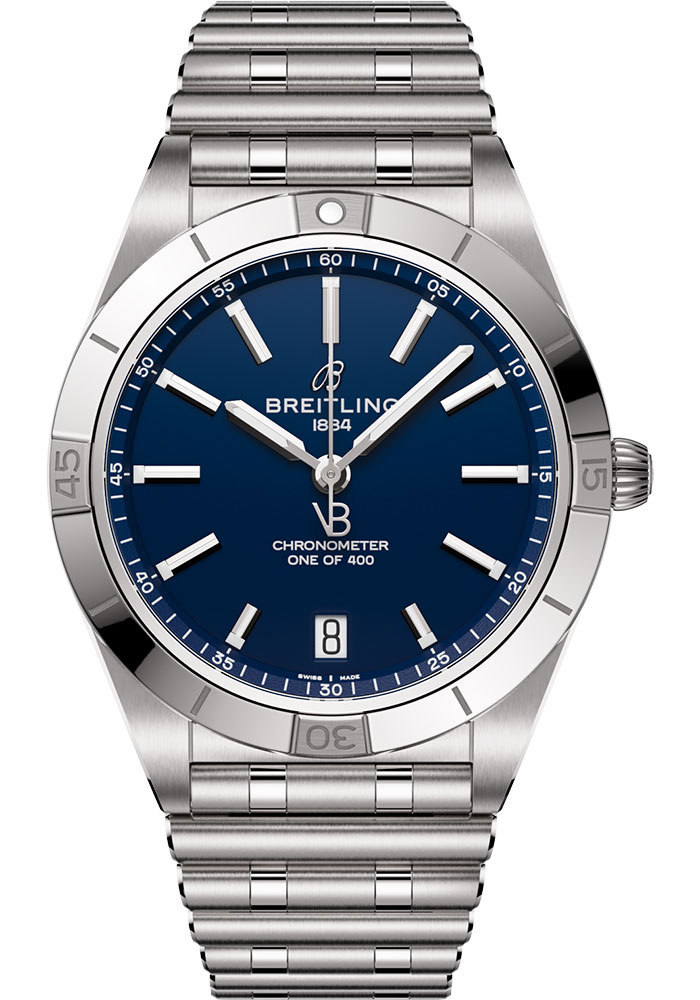 36.0 mm stainless steel case, 10.0 mm thick, non screw-locked crown with two gaskets, unidirectional ratcheted bezel, cambered sapphire crystal with glareproof treatment on both sides, midnight blue dial, Breitling 10 self-winding movement, approximately 42 hours of power reserve, stainless steel bracelet. Water resistant to 10 bars.